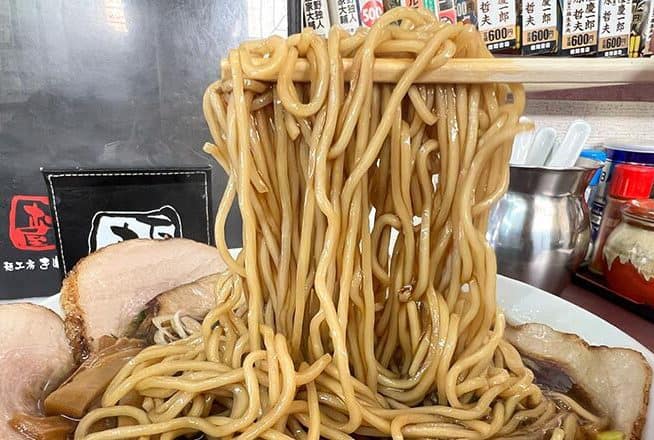 ※ 本記事の画像は「こだわりの醤油」の中の商品「肉玉らーめん(ブラック/尾道麺)」の麺持ち上げ画像となります。
